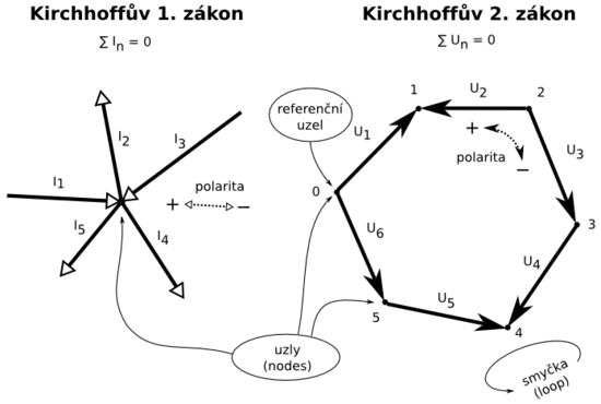 Prostřednictvím analýzy uzlů (první zákon) nebo sítí (druhý zákon) je možné najít hodnoty proudů a poklesy napětí, ke kterým dochází v kterémkoli bodě sestavy.. Prostřednictvím analýzy uzlů (první zákon) nebo sítí (druhý zákon) je možné najít hodnoty proudů a poklesy napětí, ke kterým dochází v kterémkoli bodě sestavy. Kirchhoffovy zákony jsou společně s ohmovým zákonem hlavními dostupnými nástroji pro analýzu hodnoty elektrických parametrů obvodu. Súčet výberov napätia na spotrebičoch sa v uzavretej časti obvodu (slučke) rovná súčtu elektromotorických napätí zdrojov v tejto časti obvodu.. Druhý kirchoffov zákon formuluje pre elektrické obvody zákon zachovania energie;